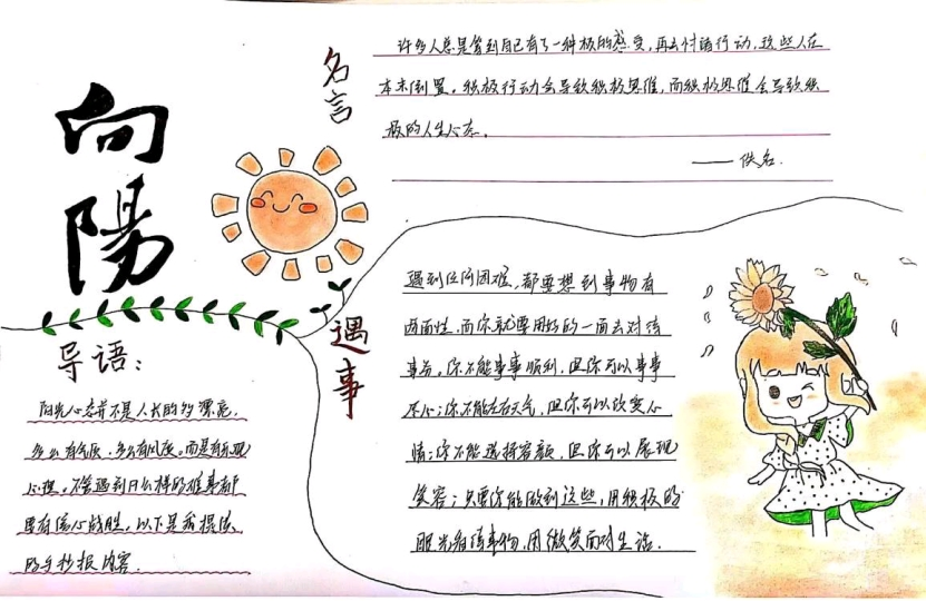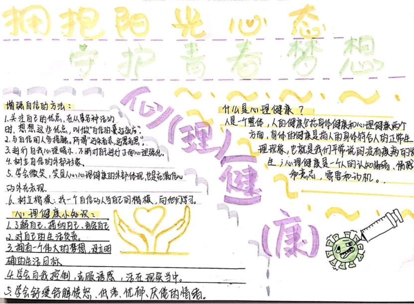 同学们在自己的手抄报中呈现了许多与心理健康有关的资料和图片,表达了自己对心理健康的认识。其中金融21411班唐誉珂同学认为遇到任何困难,都要想到事物有两面性,而我们就要用好的一面去对待事物。你不能事事顺利,但你可以事事尽心;你不能左右天气,但你可以改变心情;你不能选择容颜,但你可以展现笑容。只要你能做到这些,就能用积极的眼光去看待事物,用微笑面对生活。金融21411班陈思锜同学与我们分享了心理健康小知识和增强自信的方法。金融21411班李子晗同学则在手抄报中写出了对未来的好寄语。她希望以后的自己能如向日葵般,永远面朝阳光,努力生长、保持本色、不偏不倚、一路向阳!
