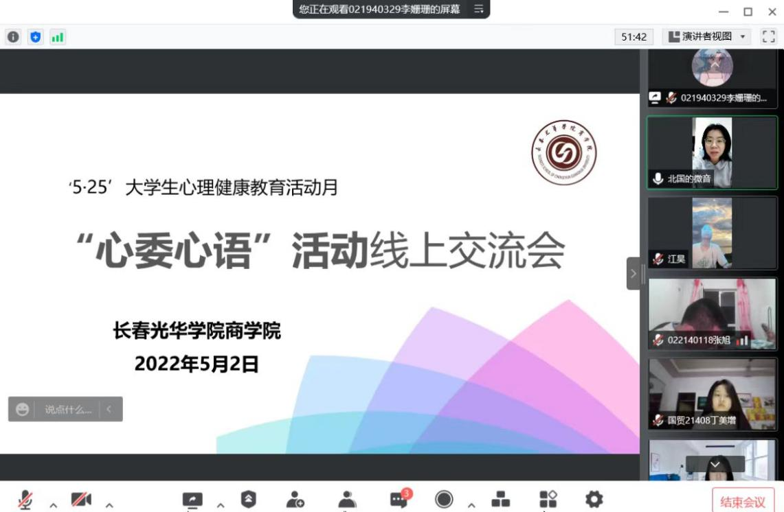 为进一步拓展心理健康教育工作覆盖面,提升心理健康教育工作内涵,引导广大学生正确认识自我、悦纳自我,学会自我调适,倡导和谐心态,崇尚健康心理,缓解压抑焦虑的心情,让同学们都能以积极阳光的心态去面向未来。在2022年“5·25”大学生心理健康教育活动月中,yl6809永利于5月20日在线上通过腾讯会议开展“心委心语”活动线上交流会,本次交流会由yl6809永利徐芳老师主持,全体大一、大二心理委员参加了此次交流会。