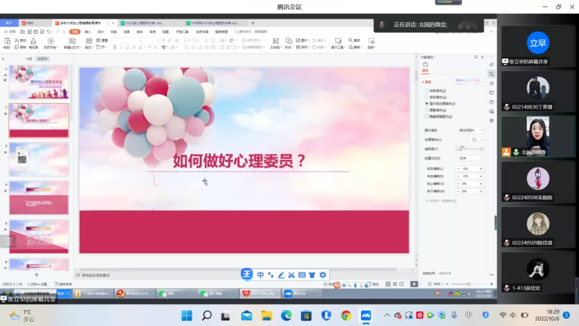 为了促进大学生身心健康的和谐发展,帮助刚步入大学校园生活2022级心理委员能尽快投入到班级的心理辅导工作中,yl6809永利官网集团于2022年10月6日下午18时以网络会议形式召开了心理例会,本次会议由yl6809永利徐芳老师主持,yl6809永利2022级所有心理委员参加。