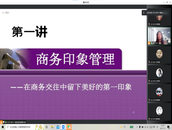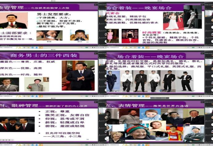会议伊始,由主持人崔佳介绍本次活动的主要内容:活动分为三大部分。首先,由主讲人带领同学们了解商务礼仪的相关知识,扩展同学们对商务礼仪的认识。随后,主持人让同学们自主展开讨论,讲述自己是否拥有一定的专业礼仪和素养以及在生活中实践的经历。同学们在听过之后,纷纷表示自己在日后的行动中能遵从商务礼仪做事,积极养成良好的专业素养。最后,主持人播放相关影像资料,让全体同学思考与商务礼仪素养相关的话题,并在会后组织撰写观后感及相关感受。