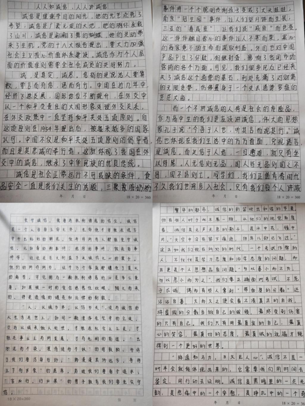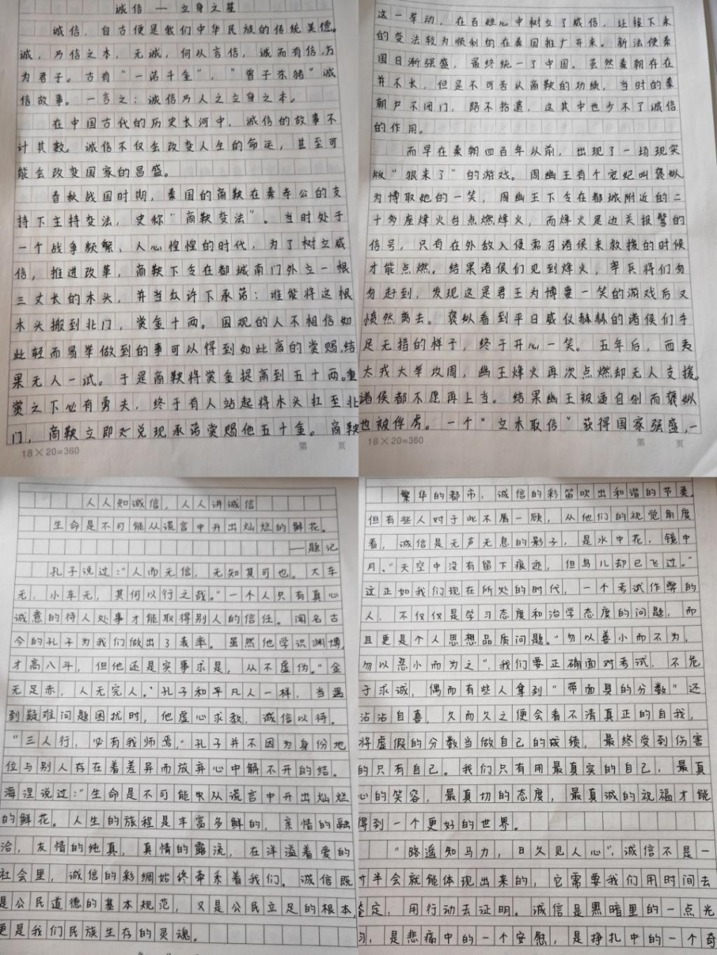 活动期间,参赛的同学们用自己的笔杆书写了以诚待人、以信立身的重要性,以个人独特的视角阐述了诚信对于个人发展的意义,本次大赛本着公平、公正的原则,组织评委对参赛作品进行筛选评比。截至27日12时,共接到50余份征文,经组委会评审共产生一等奖1名、二等奖2名、三等奖3名以及优秀奖4名。
