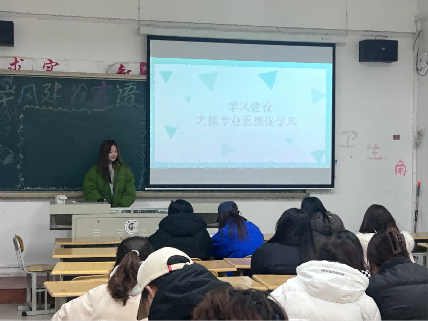 首先,学风建设宣传动员、抓专业思想促学风、抓专业技能促学风、抓典型模范促学风、抓班风建设促学风、抓文明创建促学风六个小组依次对本班的学风建设情况进行汇报,其内容着重围绕班级概况、活动内容、实施情况、取得成效、存在的不足之处以及中期总结等方面展开。随后,各班负责人在黑板上写下以“加强学风建设,提高综合素质”为主题的励志寄语,以此来激励同学们不断进取。