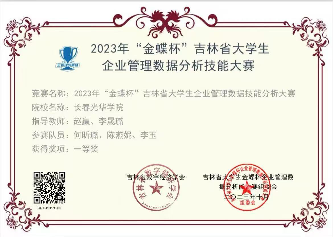在此期间,学习上积极完成各项学业任务,获得校奖学金,积极参与专业学习与社会实践,曾多次参加学科竞赛,获得2023年“金蝶杯”吉林省大学生企业管理数据分析技能大赛省赛一等奖、2022“外研社·国才杯”全国英语阅读大赛校赛一等奖、第八届金蝶云管理创新杯全国总决赛三等奖等。