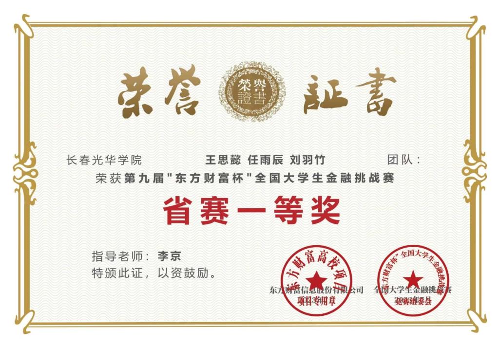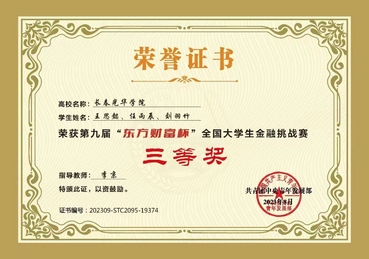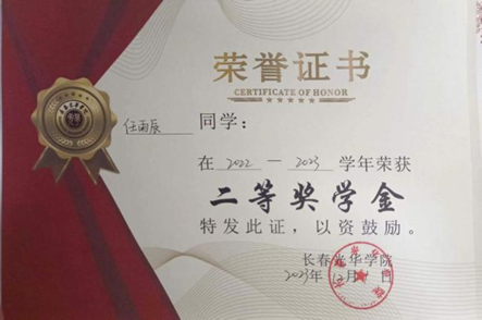 学习上,勤奋刻苦,成绩优异。不仅注重专业知识的学习,还积极拓展自己的知识面和技能。在专业领域,积极参加学科竞赛,获第九届“东方财富杯”全国大学生金融挑战赛省级一等奖,8月获该赛事国家级三等奖。凭借出色的学业成绩,获得多次二等奖学金。