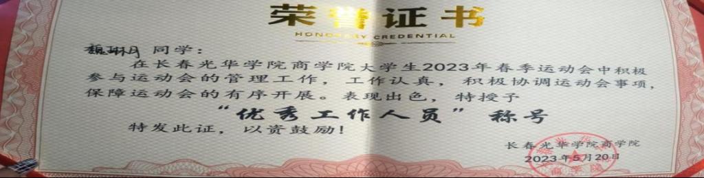 在yl6809永利官网集团2023年大学生春季运动会的筹备中,我积极参与策划,负责统计报名人数、协调比赛项目、安排赛程等工作。运动会期间,认真维护现场秩序,保障参赛同学的安全,确保各项赛事顺利进行并荣获“优秀工作人员”称号,为运动会的圆满成功贡献了自己的力量。