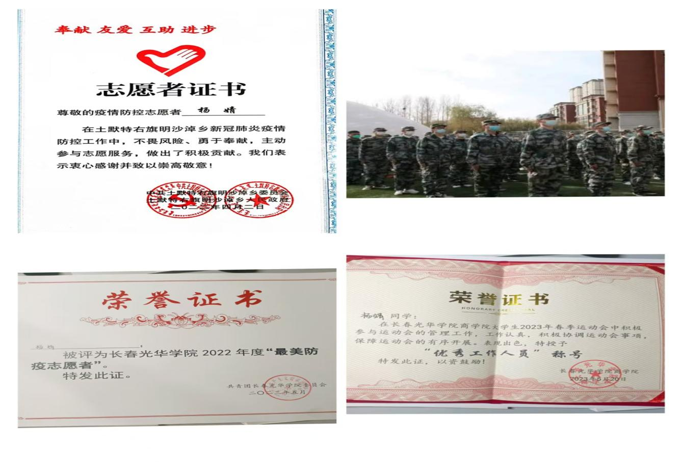 面对特殊时期的严峻挑战,作为学生会成员,她投身学院疫情防控工作一线。她每日协助统计学生健康信息,细致核对数据,确保信息零误差;在校园核酸检测现场,她引导师生有序排队、维护现场秩序,织就了一张精准温暖的校园防护网。在院运动会筹备中,她参与团队制定方案、协调场地,创新设计趣味项目;迎新季时,她提前联系新生入校时间,为新生搬运行李、答疑解惑。担任军训助理期间,她白天顶着烈日协助教官管理队伍,晚间走访宿舍安抚同学情绪。在毕业生工作中,她主动协助辅导员整理就业档案,连续两周加班核对信息;她建立"毕业服务群",每日推送政策解读,帮助同学解决档案转递、党团关系转接等问题。