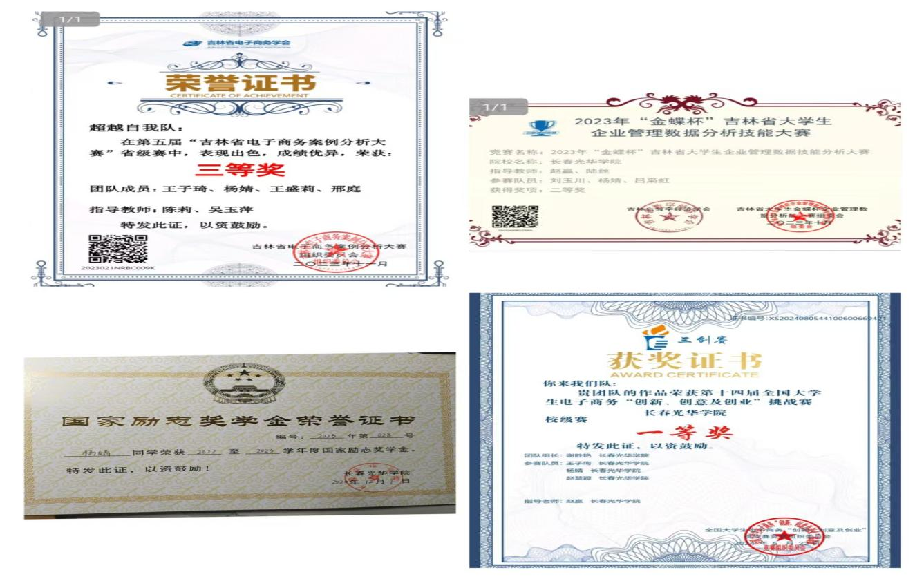 在学业方面,她以勤勉治学立身,连续三年学分绩点稳居专业前20%,用笔尖丈量知识的深度。课堂之外,她更活跃于学科竞技舞台,在电子商务大赛、“金蝶杯”企业管理数据技能分析大赛和创新、创意及创业挑战赛等常规赛中多次获得省级奖项。