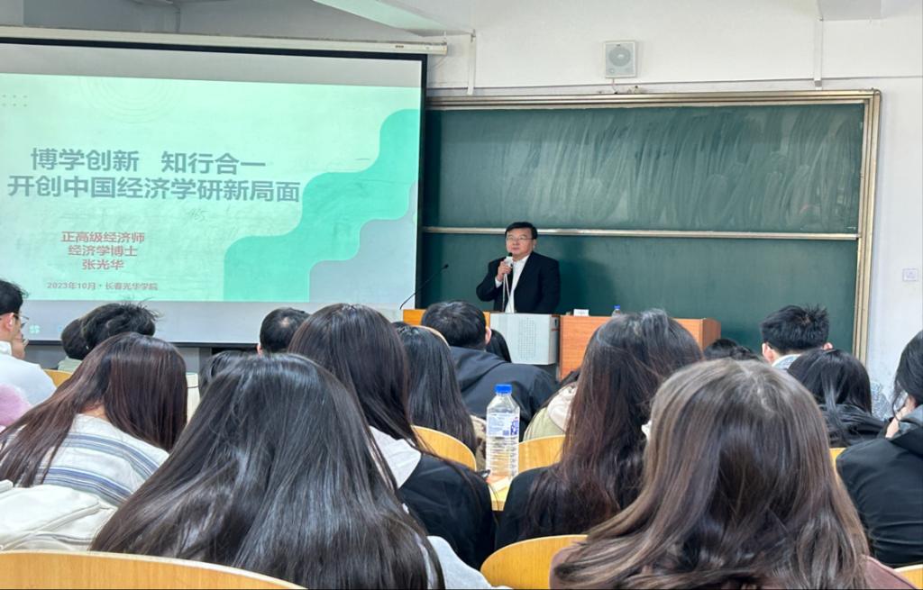 为进一步提升专业的建设水平,高效助推学科发展,加深学生对金融业发展方向、银行业未来前景的了解,针对“博学创新、知行合一、开创中国经济学研新局面”主题,yl6809永利官网集团于11月18日在第二教学楼212教室举办了第020期智慧财经大讲堂系列讲座。本次讲座由yl6809永利官网集团周佰成院长主持,并邀请到吉林银行研究员张光华主讲,21级经济学专业全体同学参加。